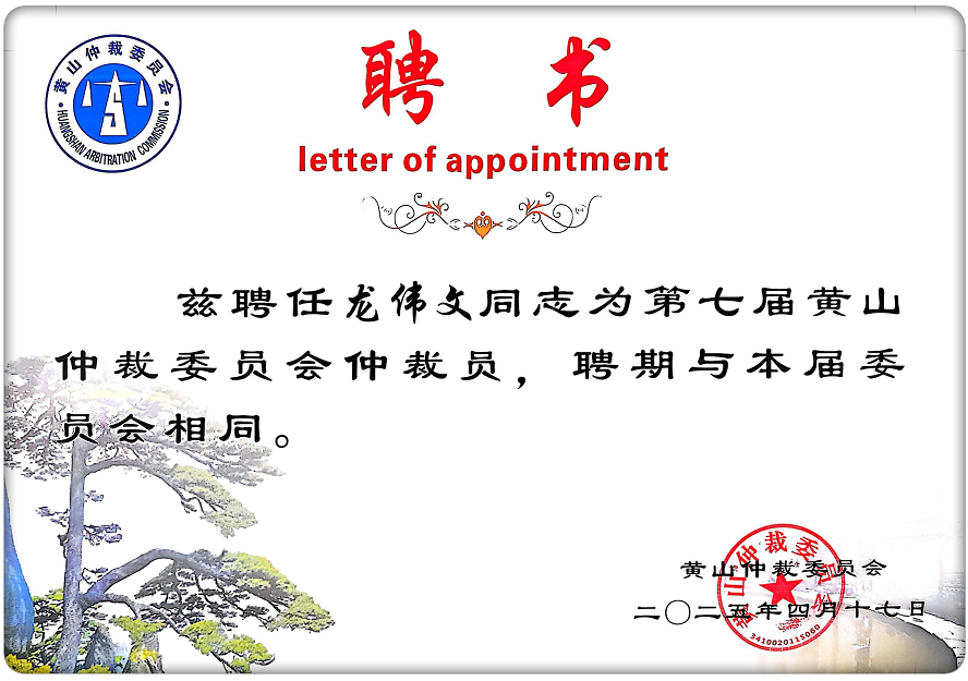 龙伟文律师获聘第七届黄山仲裁委员会仲裁员