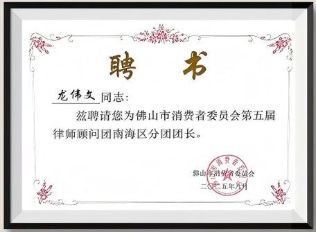 2025年8月22日,广东大润律师事务所龙伟文主任律师收到由佛山市消费者委员会颁发的“第五届律师顾问团南海区分团团长”的聘书。消费者权益保护是一项非常有意义的工作,它关乎我们每一个人,也关乎社会的公平正义。广东大润律师事务所龙伟文主任律师将继续与佛山市消费者委员会携手为社会贡献更多专业的力量,共同维护公平健康的消费环境。
