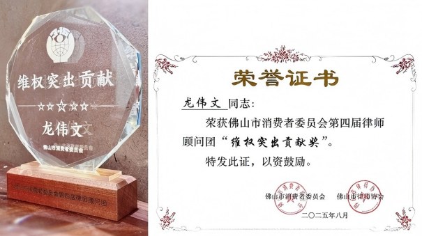2025年8月22日,广东大润律师事务所龙伟文主任律师荣获佛山市消费者委员会第四届律师顾问团“维权突出贡献奖”。带着这份崇高的荣誉,广东大润律师事务所在龙伟文主任律师的带领下,将继续恪尽社会责任,守护消费者权益。