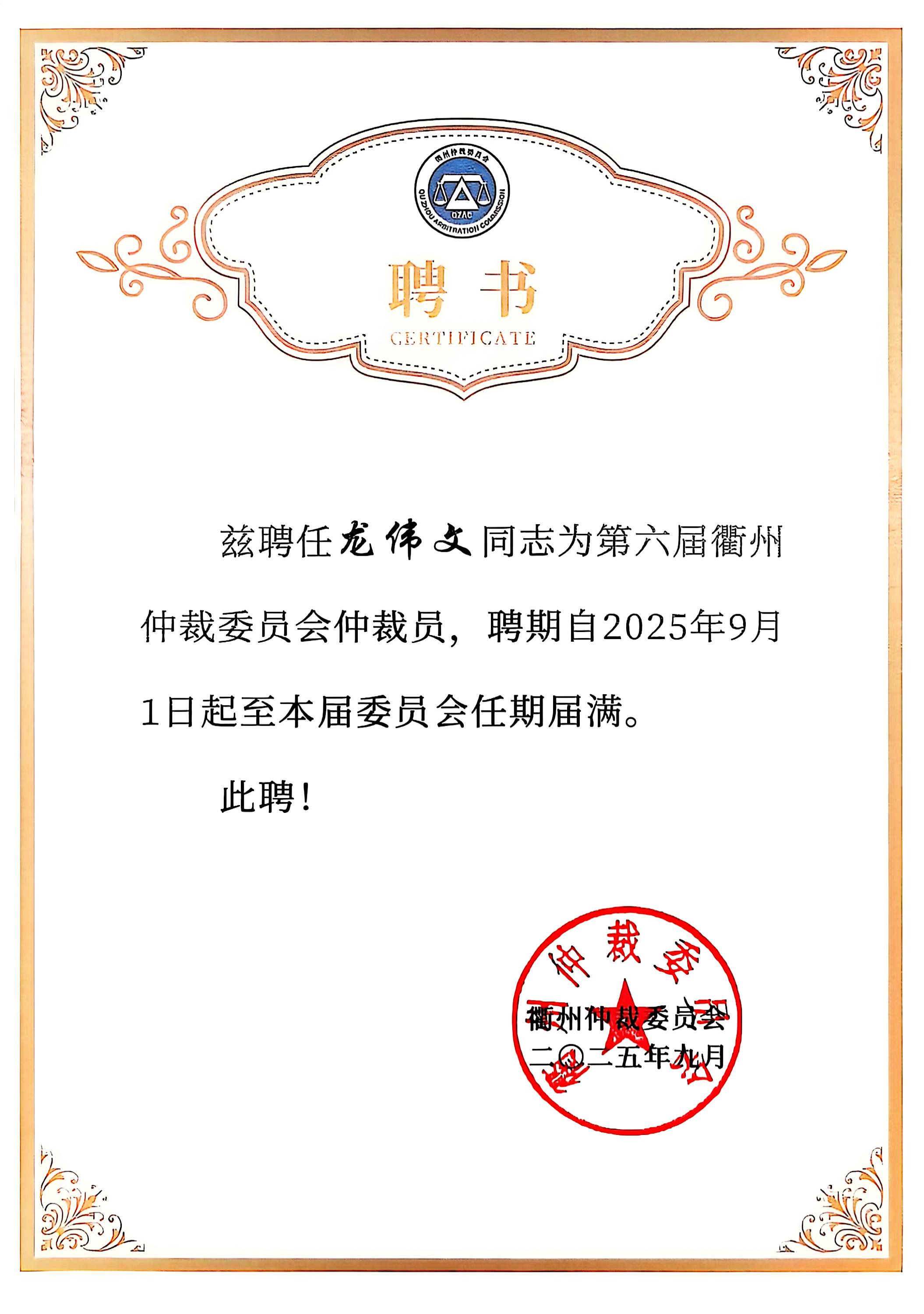 2025年9月,衢州仲裁委员会聘任广东大润律师事务所龙伟文主任律师为第六届衢州仲裁委员会仲裁员。