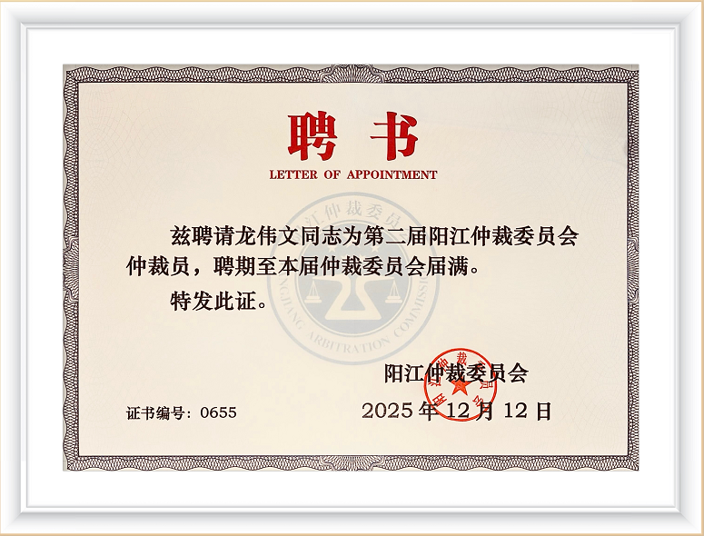 阳江仲裁委员会聘请广东大润律师事务所龙伟文主任律师为第二届阳江仲裁委员会仲裁员,聘期至本届仲裁委员会届满。阳江仲裁委员会于2025年12月12日向龙伟文主任律师正式颁发聘书。