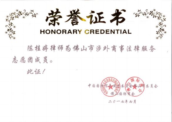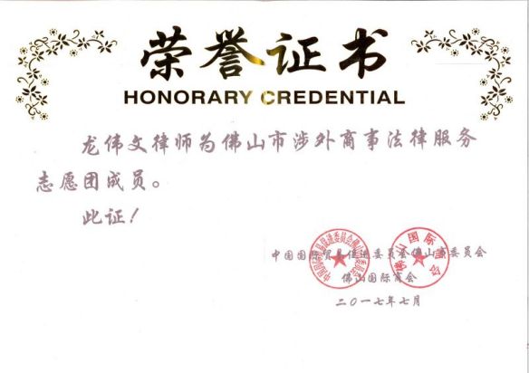 我广东大润律师事务所龙伟文律师、陈桂婷律师获中国国际贸易促进委员会佛山市委员、佛山国际商会颁布佛山市涉外商事法律服务志愿团成员证书。
