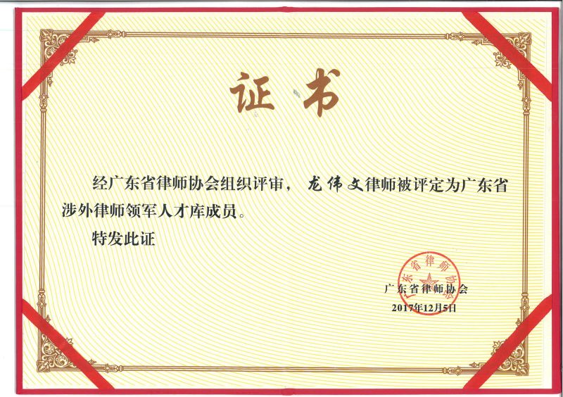 龙伟文律师经广东省律师协会评定为涉外律师领军人才库成员