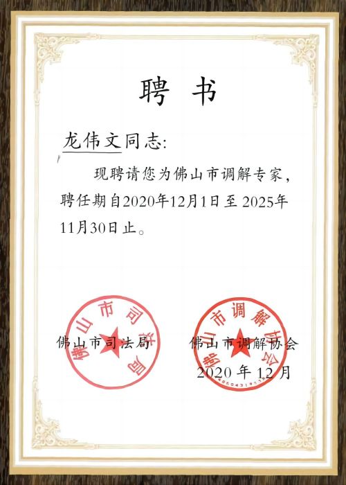 2020年12月,佛山市司法局、佛山市调解协会聘请广东大润律师事务所龙伟文主任律师为佛山市调解专家。