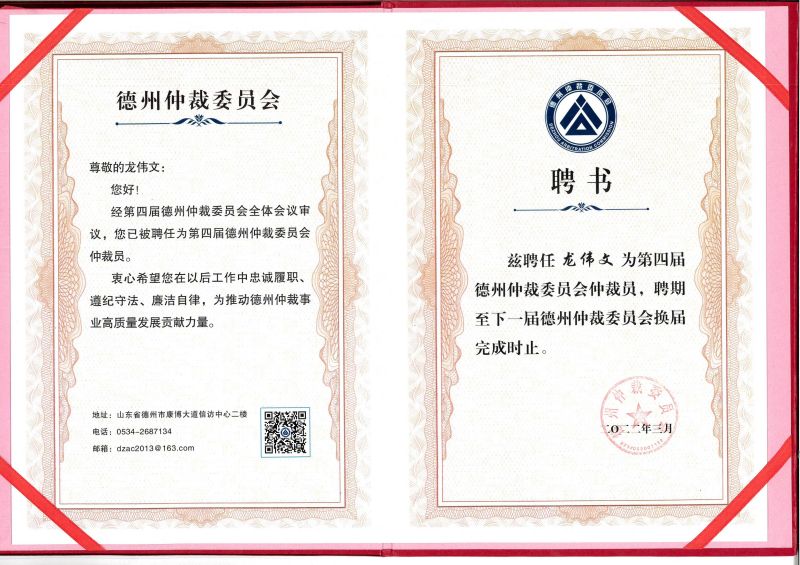 2022年3月,德州仲裁委员会聘请广东大润律师事务所龙伟文主任律师为第四届德州仲裁委员会仲裁员。