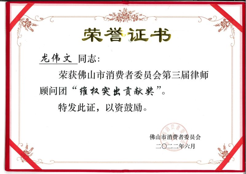 2022年6月,广东大润律师事务所龙伟文主任律师荣获佛山市消费者委员会律师顾问团的“维权突出贡献奖”。