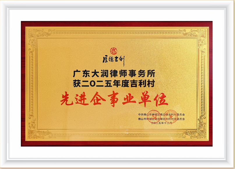 2025年1月,广东大润律师事务荣获中共佛山禅城区南庄镇吉利村委会、佛山市禅城区南庄镇吉利村村民委员会颁发的2025年度吉利村先进企事业单位称号。在我所已连续三年获颁该称号。成绩来之不易,这份荣誉不仅是对我所过去一年工作的肯定,更是对未来的期许。我们始终秉持“厚德明法,务实笃行”的理念,为吉利村集体与村民提供优质高效的法律服务,助力乡村法治建设。